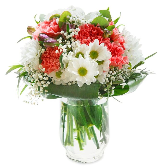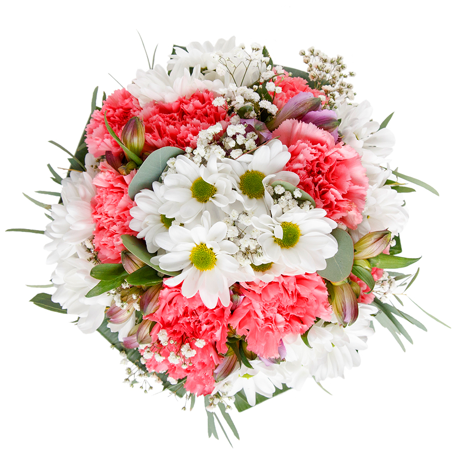 Celebrate with our elegant mixed bouquet featuring pristine white and soft pink blooms. This stunning arrangement combines snow-white chrysanthemums, airy gypsophila, delicate light pink carnations, and lush aspidistra leaves, creating a visually captivating display perfect for any occasion.